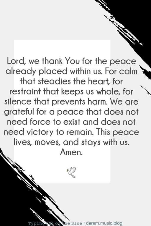 Peace be with you all: Towards an unarmed and disarming peace A short prayer of gratitude for peace that already lives within us and moves quietly through how we live. ⌨ ᴛʸᵖⁱⁿᵍ ᴏᵘᵗ ᵒᶠ ᵗʰᵉ ʙˡᵘᵉ ᵈᵃʳᵉᵐ ᵐᵘˢⁱᶜ ᵇˡᵒᵍ Listen. Buy. Download. Related